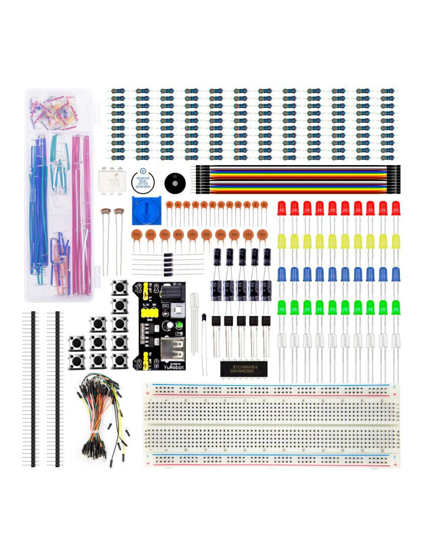 El "Kit de componentes electrónicos Arduino proto cables" es ideal para los amantes de la programación y electrónica. Vas a poder experimentar con los los diversos componentes que incluye el kit: resistencias, leds, buzzers, botones, resistencia variable y cables, entre otras cosas, además incluye protoboard con modulo de alimentación. Se entrega en caja organizadora para que los componentes no se mezclen.