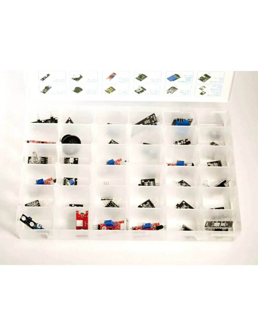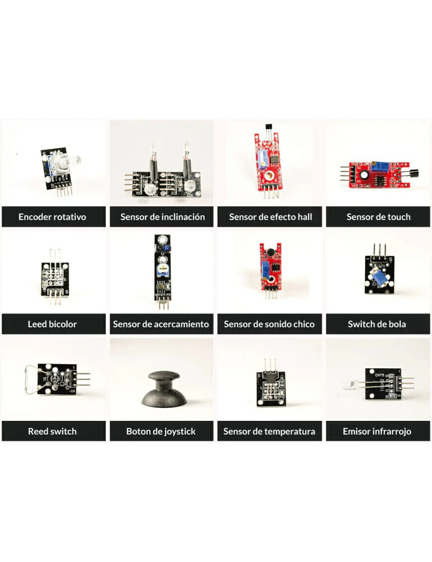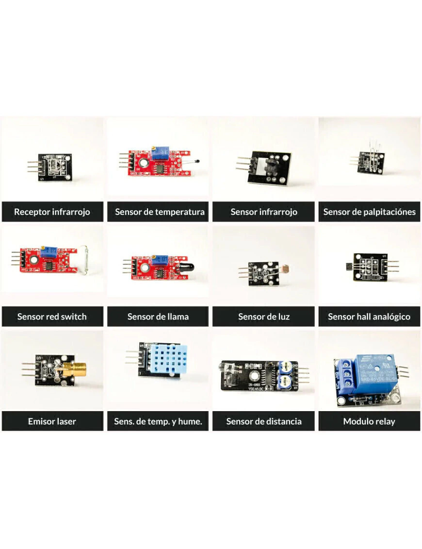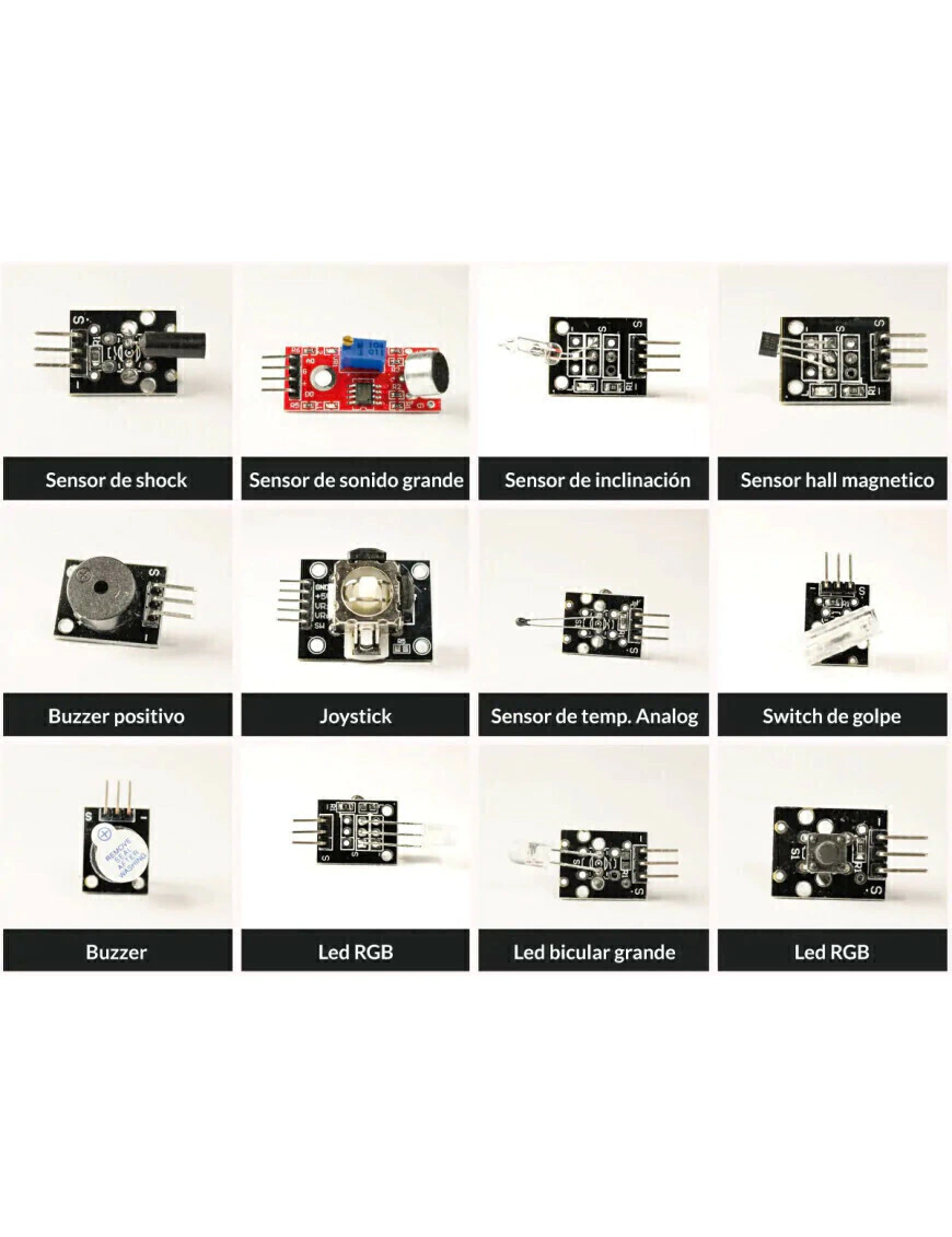 Uno de los kits Arduino más completos del mercado, orientado a los amantes de la programación y electrónica que busquen realizar sus propios proyectos tecnológicos. Con los diversos sensores que componen a este kit usted podrá programar e interactuar con el ambiente en el que se encuentra mediante la tecnología, ya que el kit contiene una amplia de sensores de gran utilidad, como puede ser el caso del sensor de llama, de acercamiento, de sonido, de luz, de temperatura, entre otros. ¿El proyecto? Su imaginación, en caso de necesitar ayuda para saber puede apoyarse en los que te proponemos nosotros.